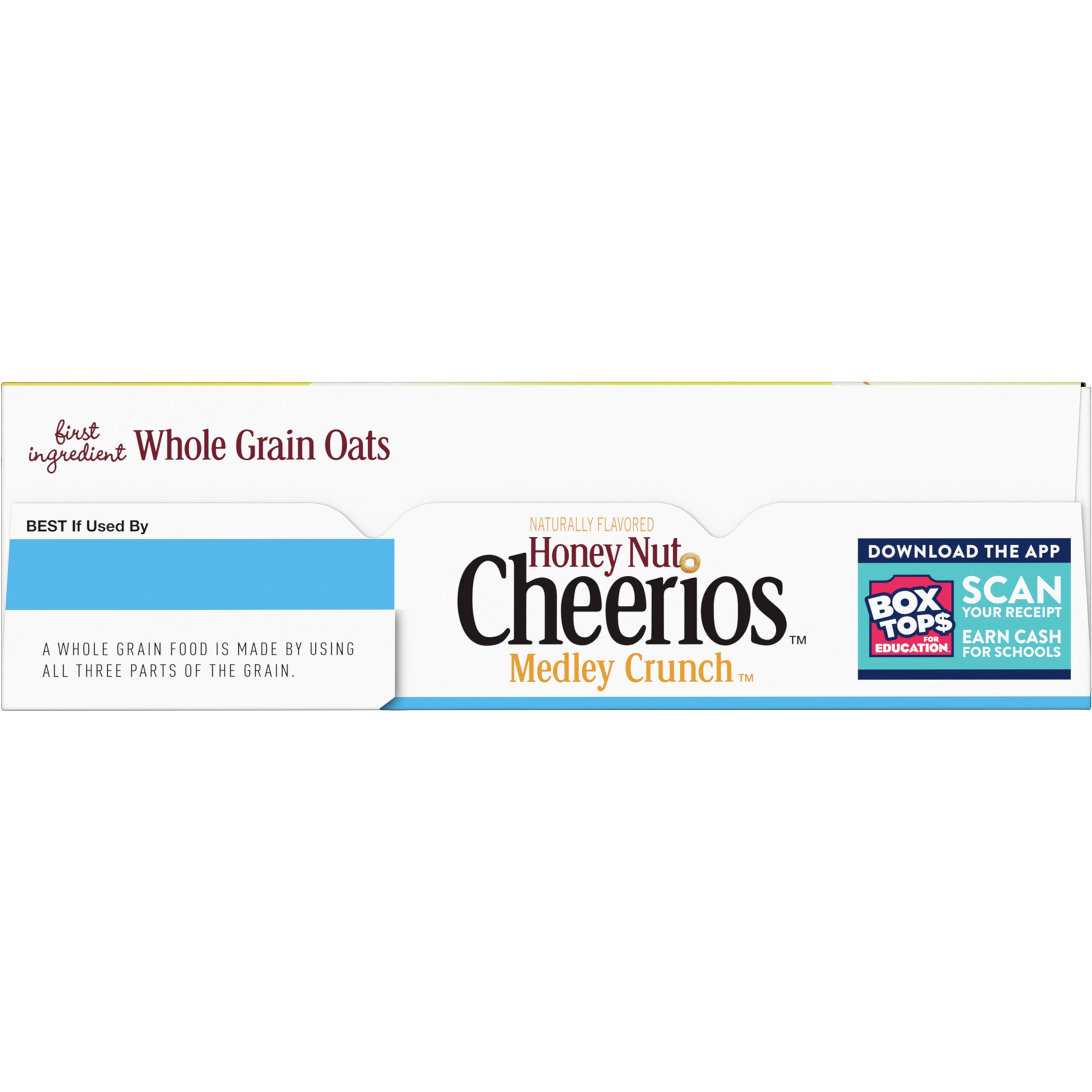 Honey Nut Cheerios Medley Crunch Honey Nut Cheerios Medley Crunch cereal provides 0.75 grams per serving. Store this cereal in your pantry for a quick breakfast food or a snack. This cereal box contains about 11 servings and is an official participating Box Tops product.